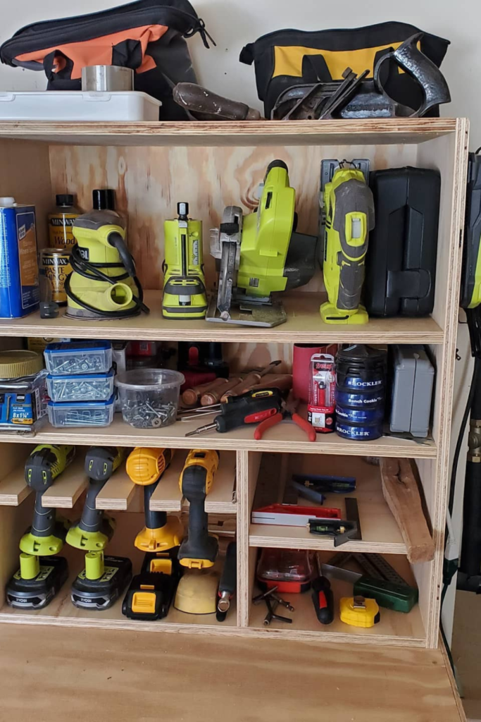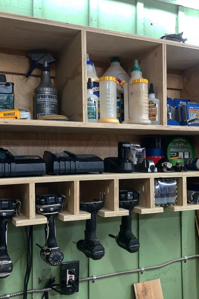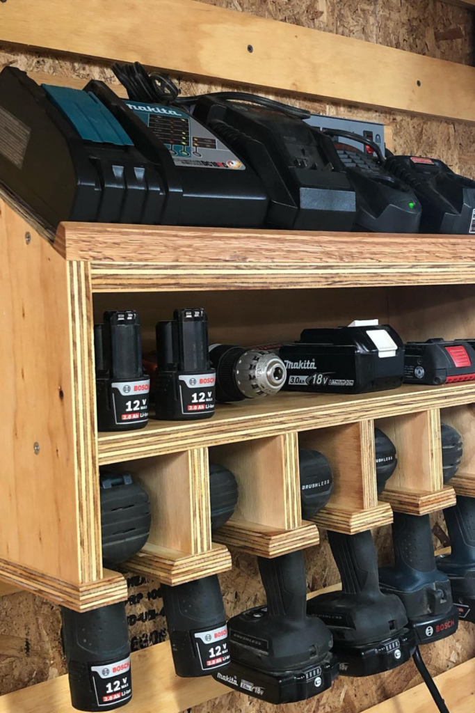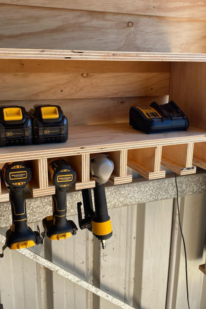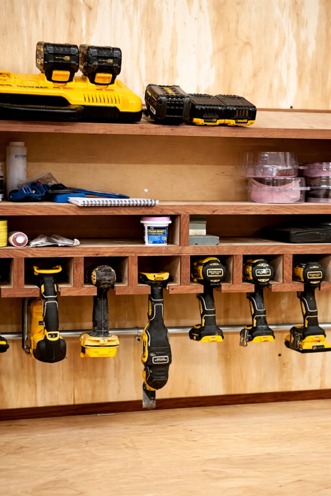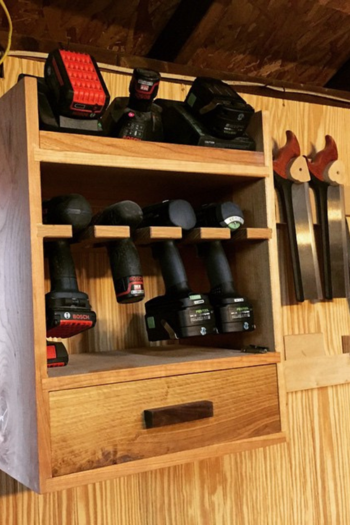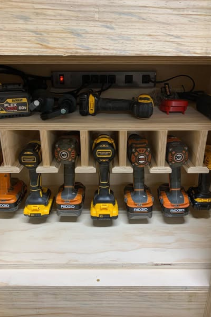 Divide upper cubbies by tool type, dedicate a middle shelf for chargers, and store cases below. Build it deep enough for larger tools.