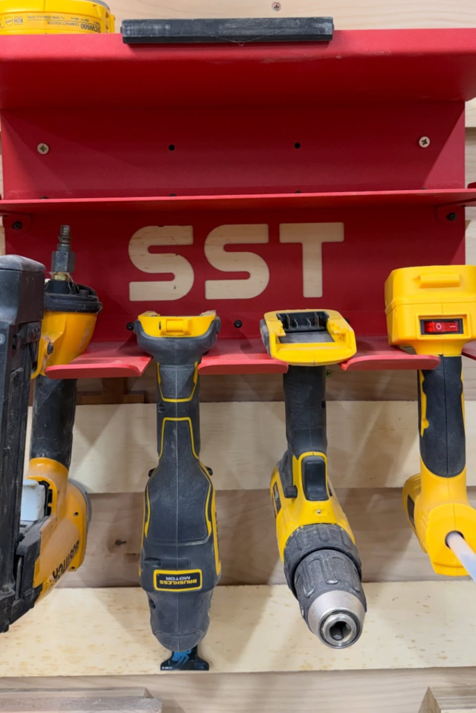 Hang drills below in evenly spaced slots. Bright overhead shop lights help you see charging indicators instantly.