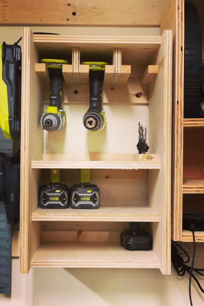 Serious tool collections need serious structure. A full-height cabinet like this turns one wall into a complete drill-and-battery station.