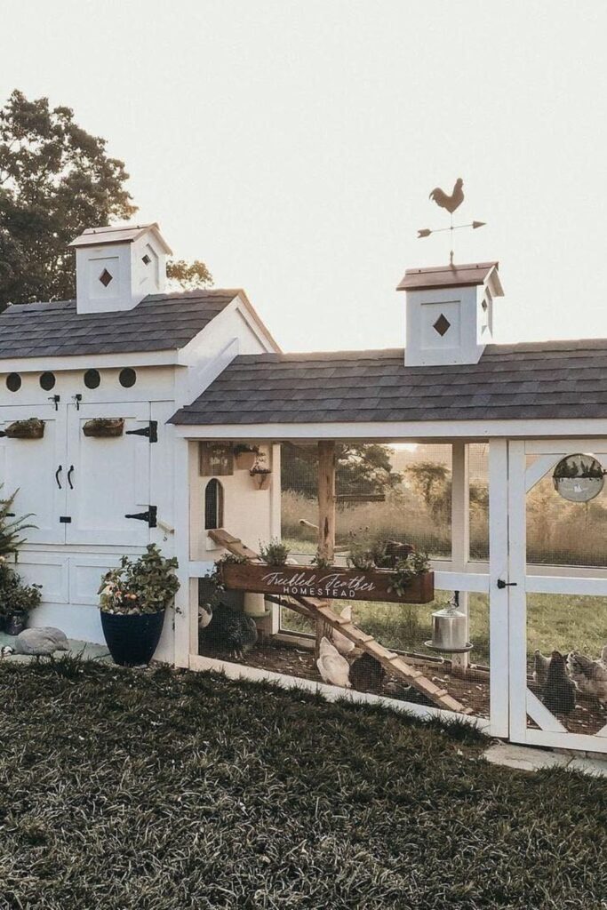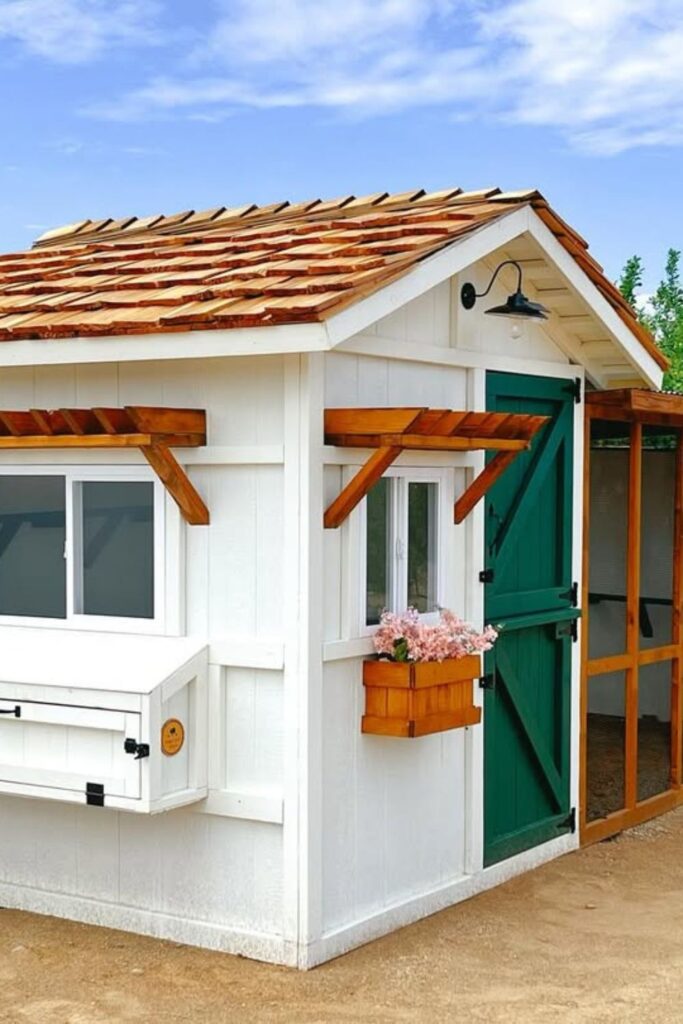 Include a cozy enclosed run to keep them safe while presents space to roam. Complete the look with adorable flower boxes, giving your coop a welcoming homestead feel.