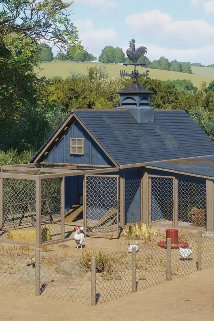 Give the coop timeless appeal with a deep navy finish, a classic roofline, and a rooster weathervane.