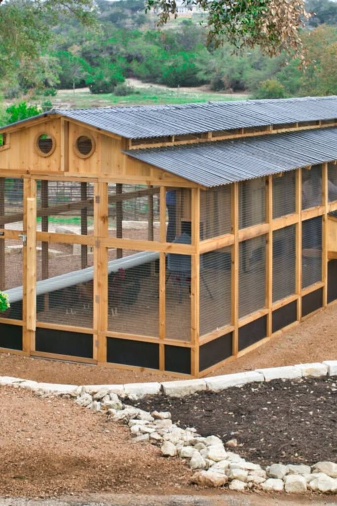A covered run offers fresh air while keeping chickens safe from predators.