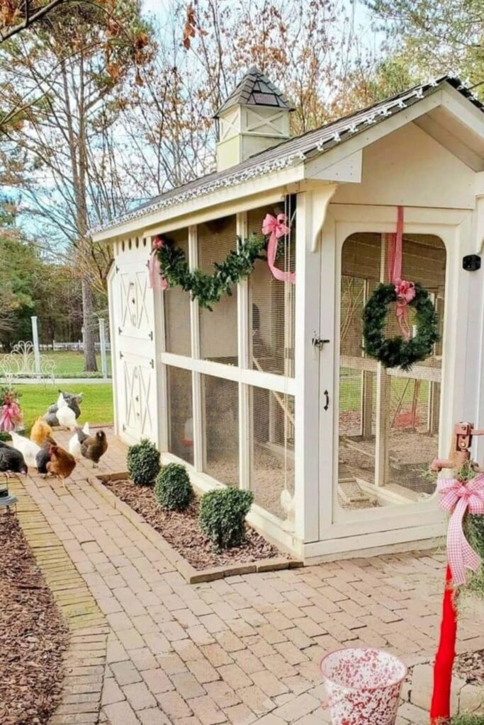 Bring festive charm to your yard with a barn-style coop featuring holiday wreaths and decorative bows.