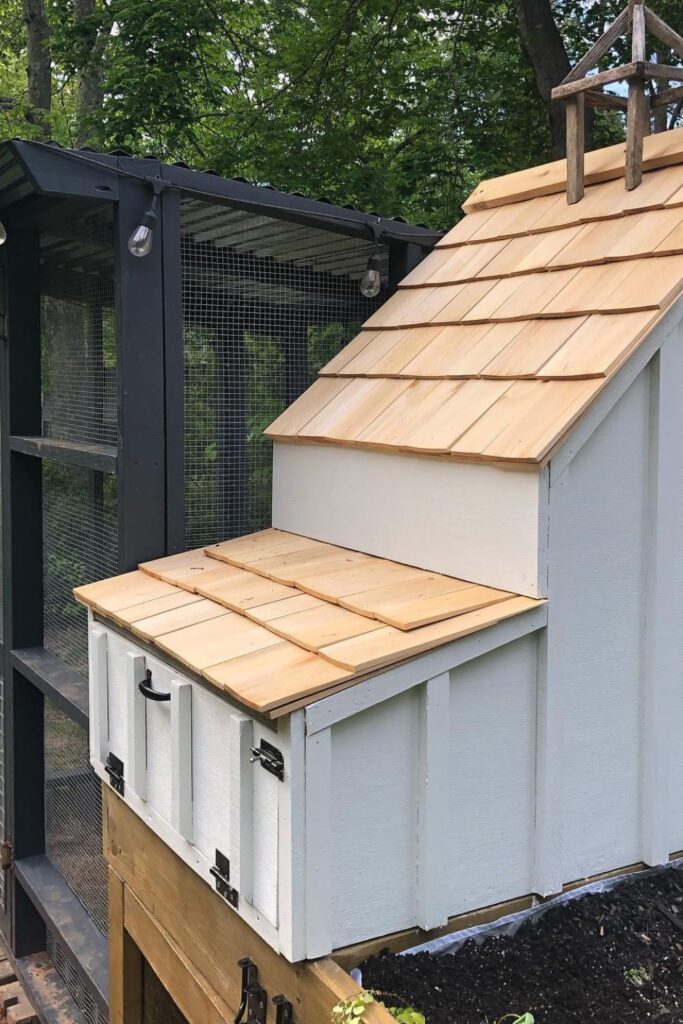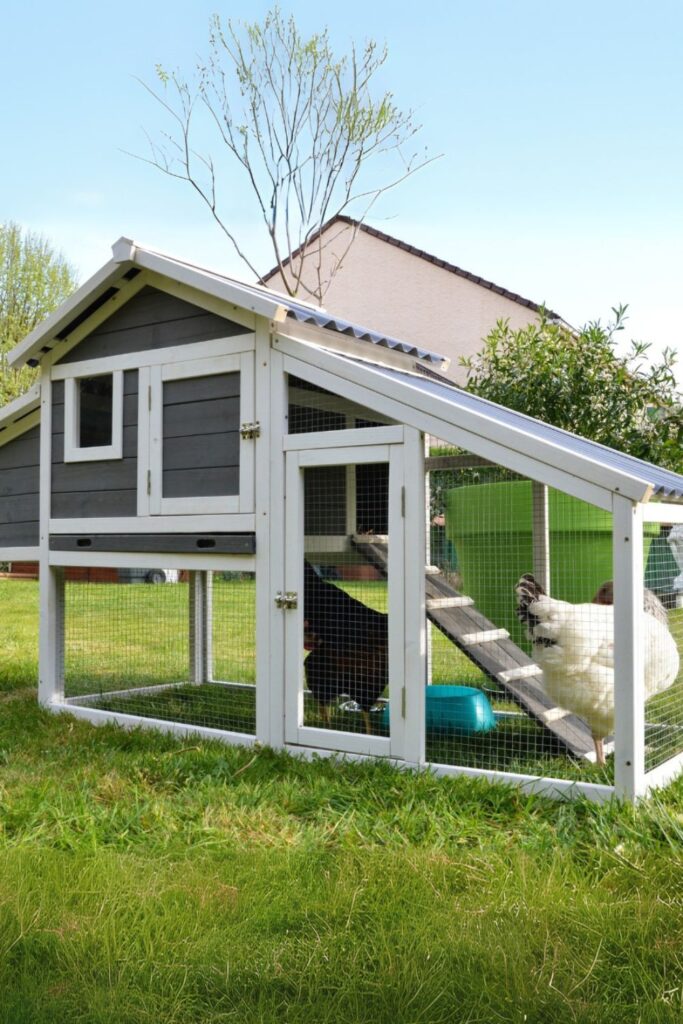 Achieve sleek and functional with a gray-and-white coop featuring a sloped roof for easy water drainage.