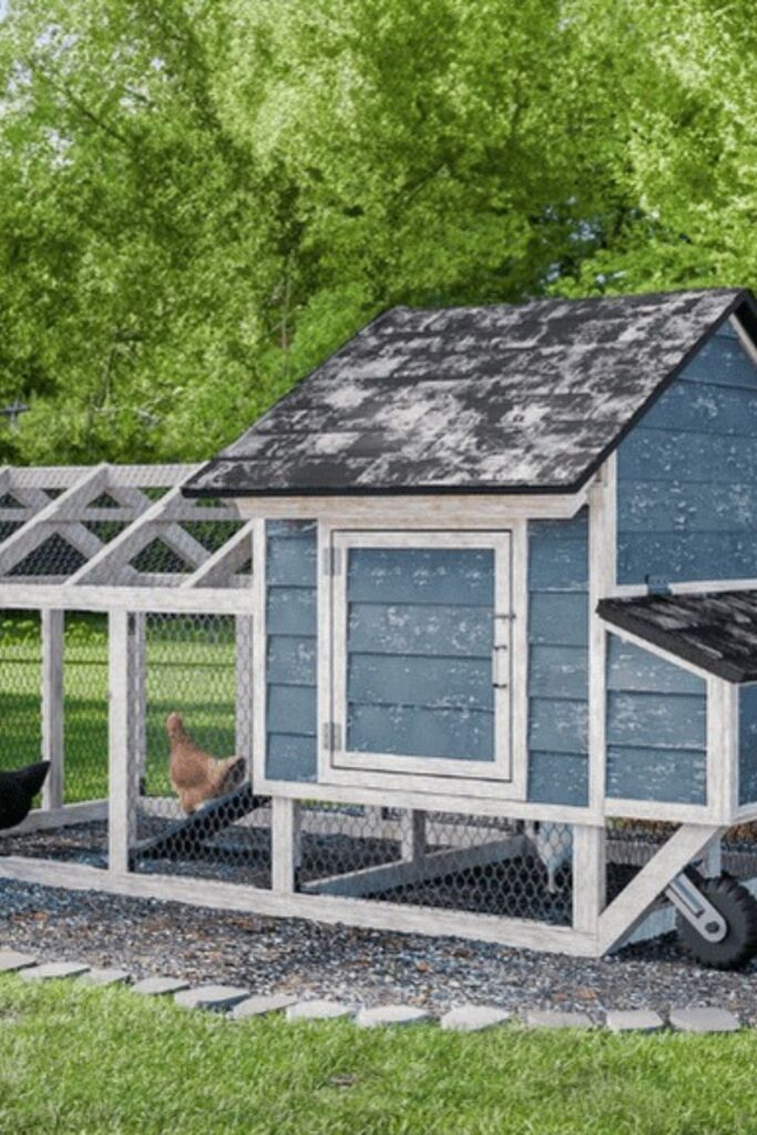 Add mobility to your setup with this blue-and-white wheeled coop.