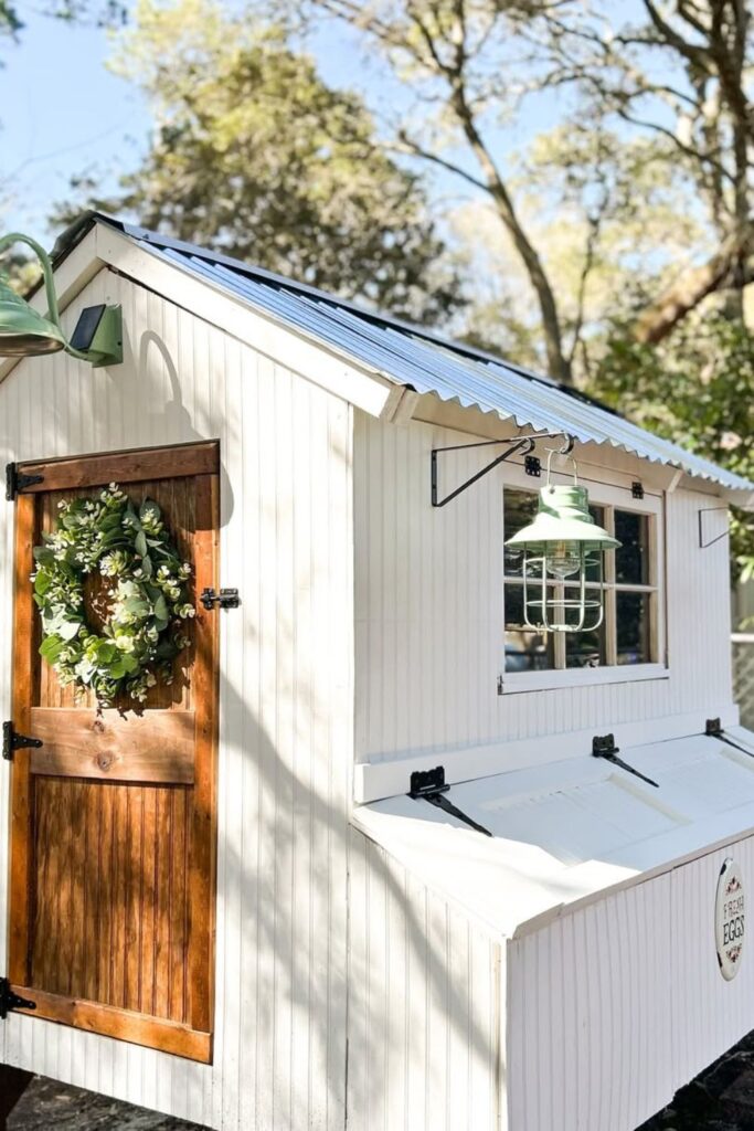 Turn your coop into a storybook paradise with white siding, a deep green roof, and charming black-framed windows.