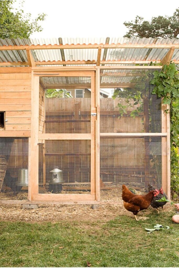 Make backyard farming easy with a coop built from corrugated roofing and plank walls.