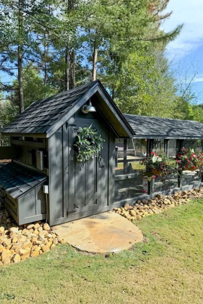Create a grounded, natural design with a bold charcoal gray paint for the coop that blends seamlessly into its surroundings.