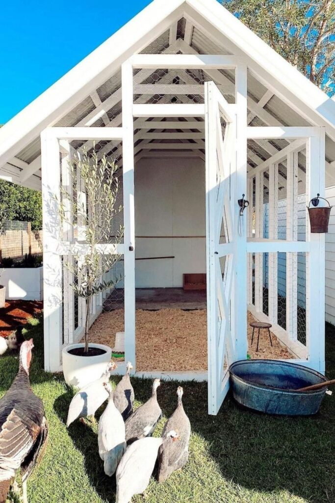 Bring country charm home with an all-white coop featuring a pitched roof and wire mesh sides for airflow.