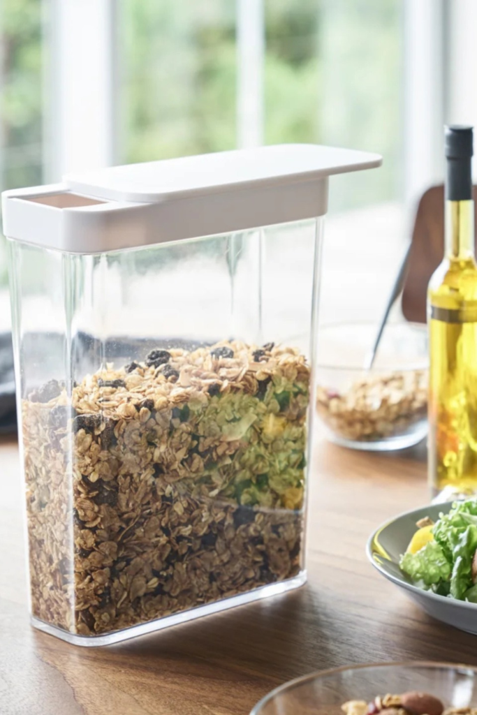 Your pantry overflows, but you still need daily items close by, work best on countertops for pasta, snacks, and dry add-ins you use often.