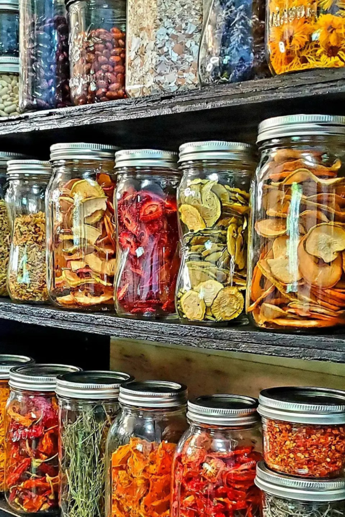 Store herbs, dried fruits, spices, and dehydrated vegetables. Use clear jars with tight lids so moisture stays out.
