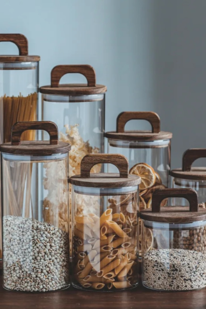 Transfer snacks, grains, pasta, and beans into clear jars and label them clearly, airtight lids protect against moisture.