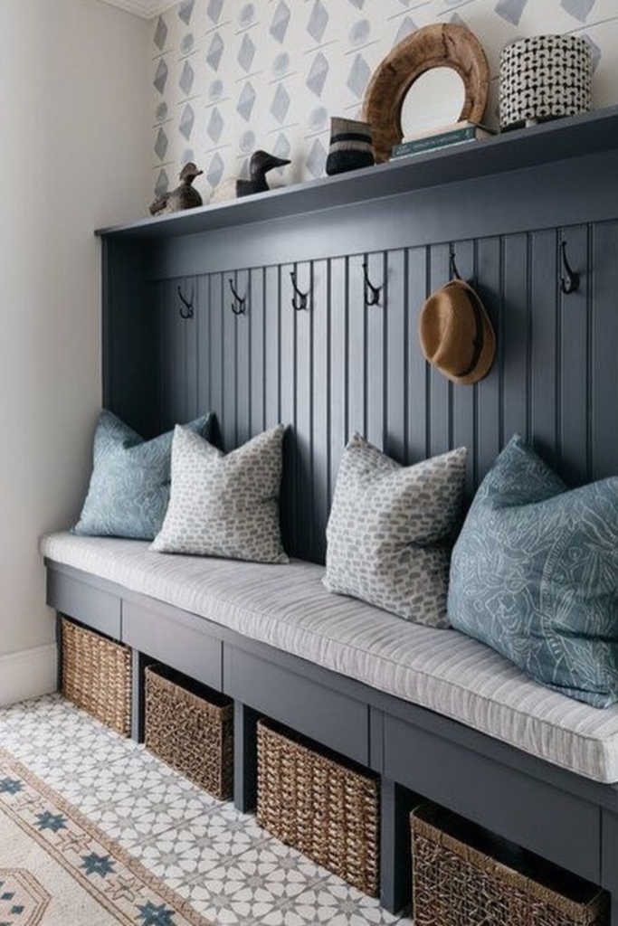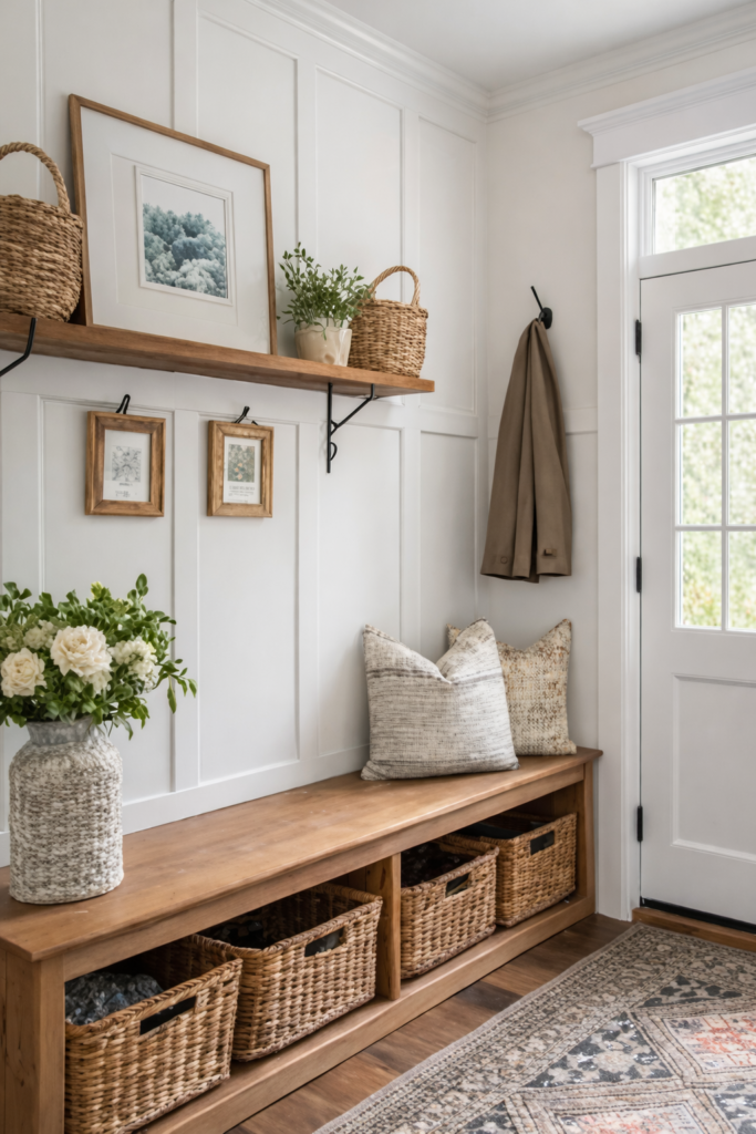 Baskets tucked below the seat handle shoes, scarves, or random clutter without making the space feel busy.