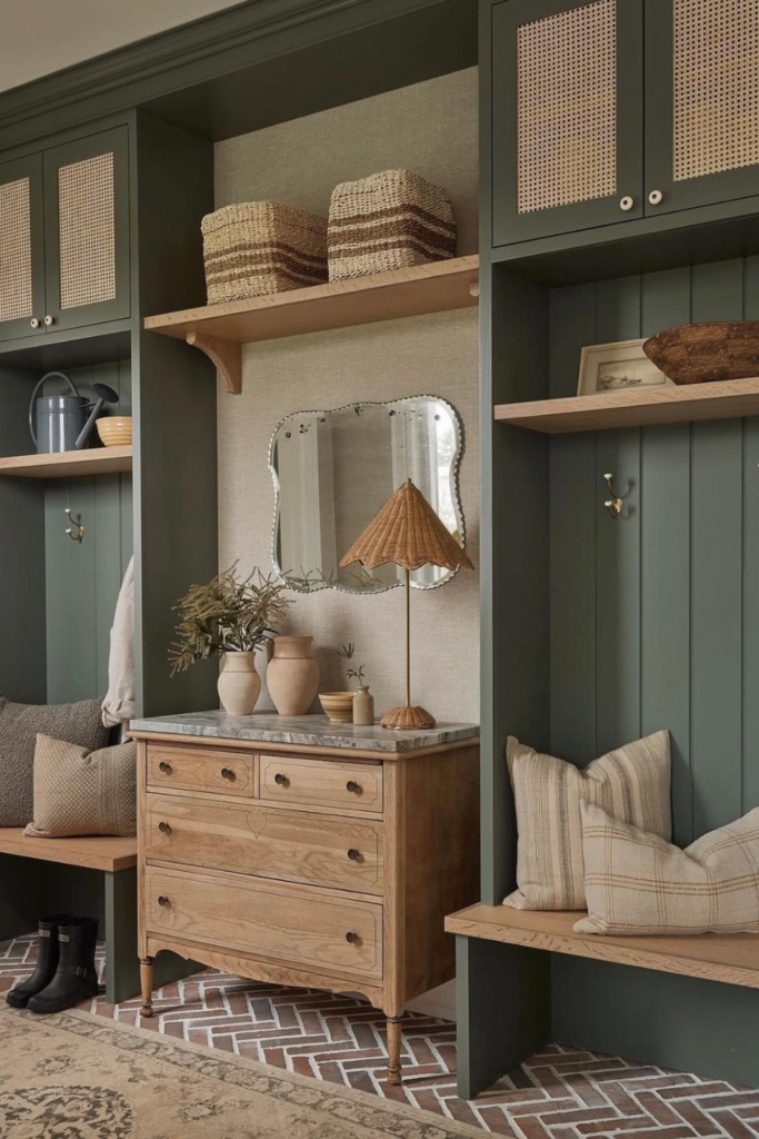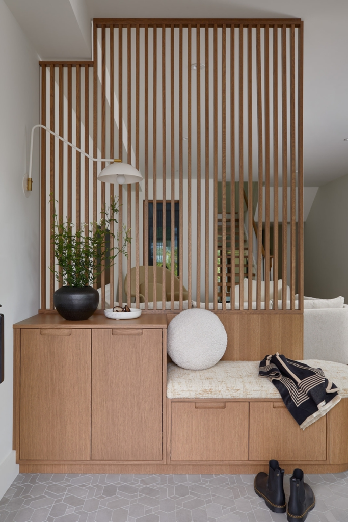 Keeps shoes and clutter hidden, while a vertical slatted divider adds structure without making the entry feel boxed in.
