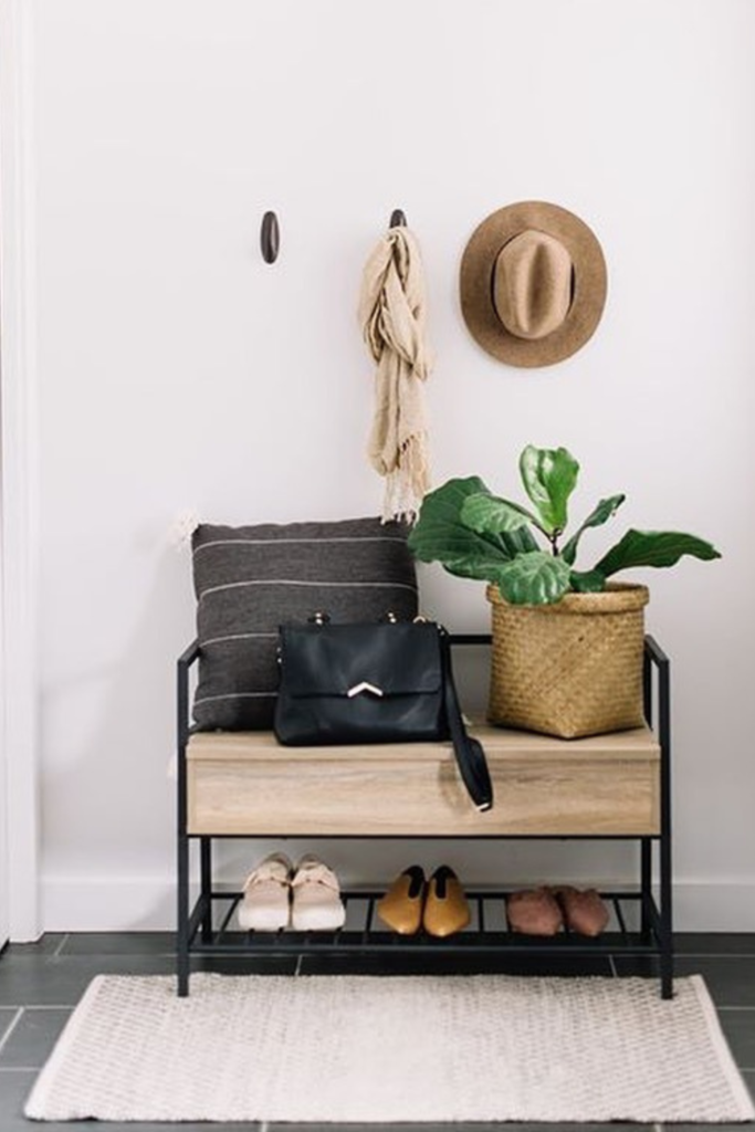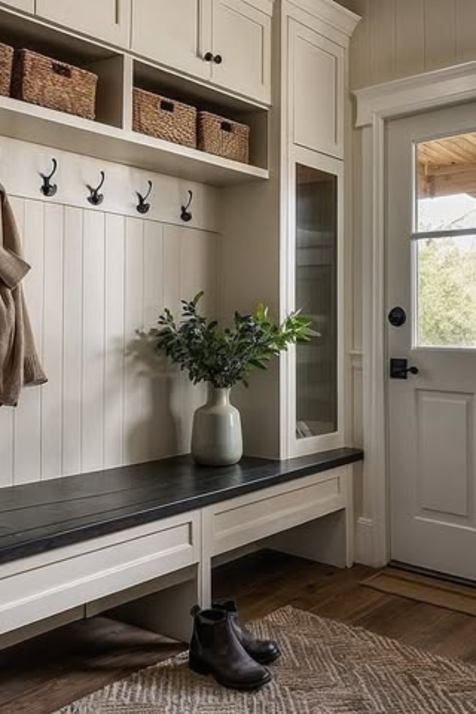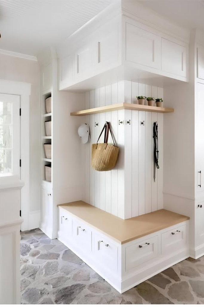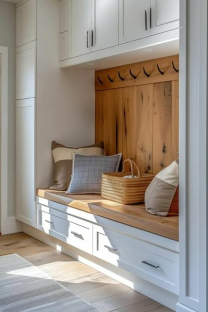 Built-in shelving or adding a slim shoe rack below a sturdy seat. Keep hooks spaced out so bags don’t overlap.