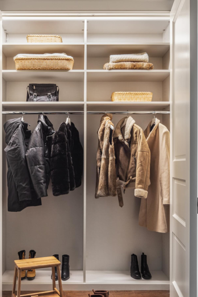 Double hanging rods instantly double your storage, while upper shelves hold baskets for gloves, scarves, and seasonal extras.