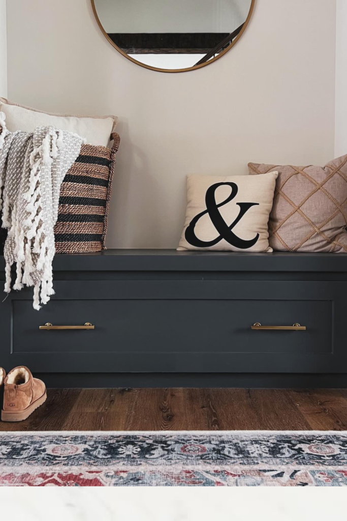 Open floor plans need storage that blends in, not blocks off the space. Built-in bench with closed cabinets.