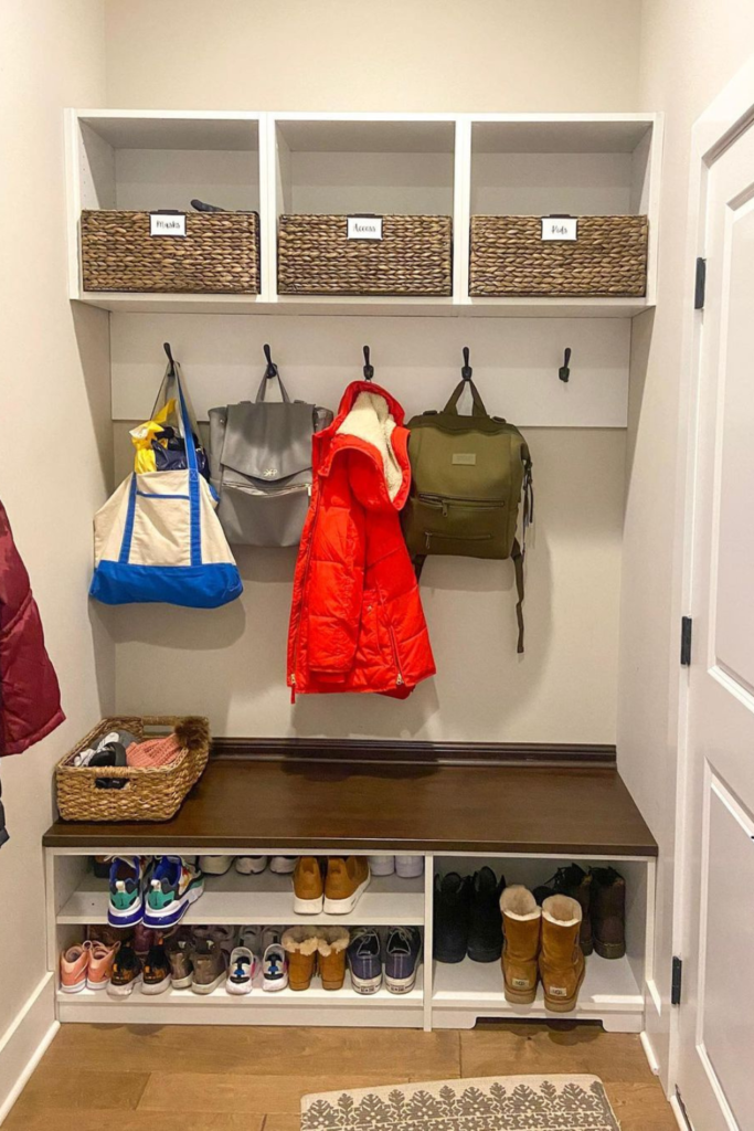 Individual hooks for backpacks and coats stop the daily mix-ups, while labeled baskets above hold hats, gloves, and small extras.