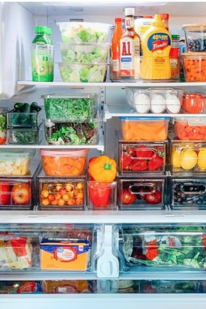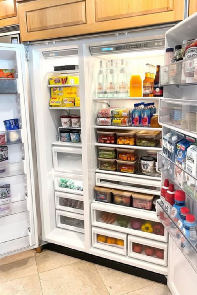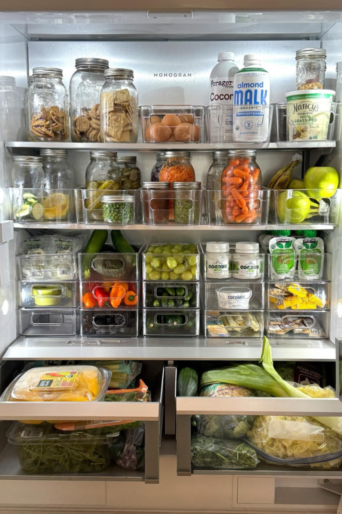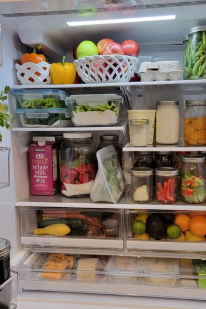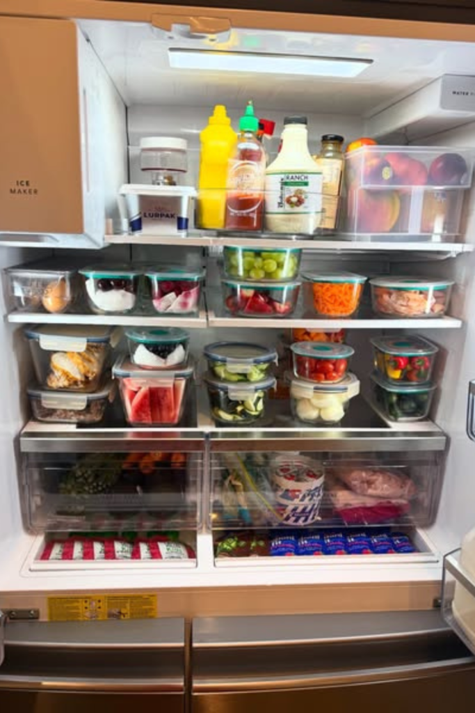 This fridge works because chopped vegetables, cooked grains, and washed greens are stored front and center, not buried in drawers.
