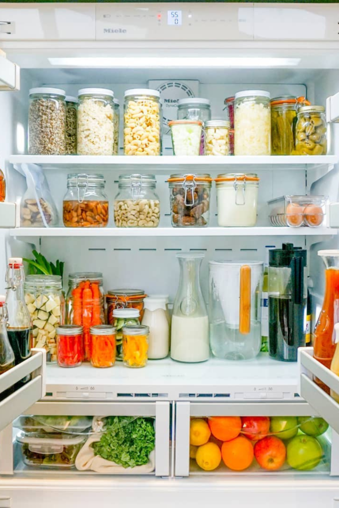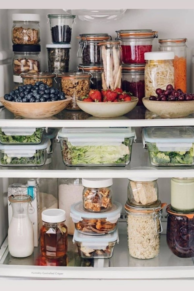 Recreate this by placing ready-to-eat fruit or snacks in open bowls and storing prepped items in sealed jars behind them.