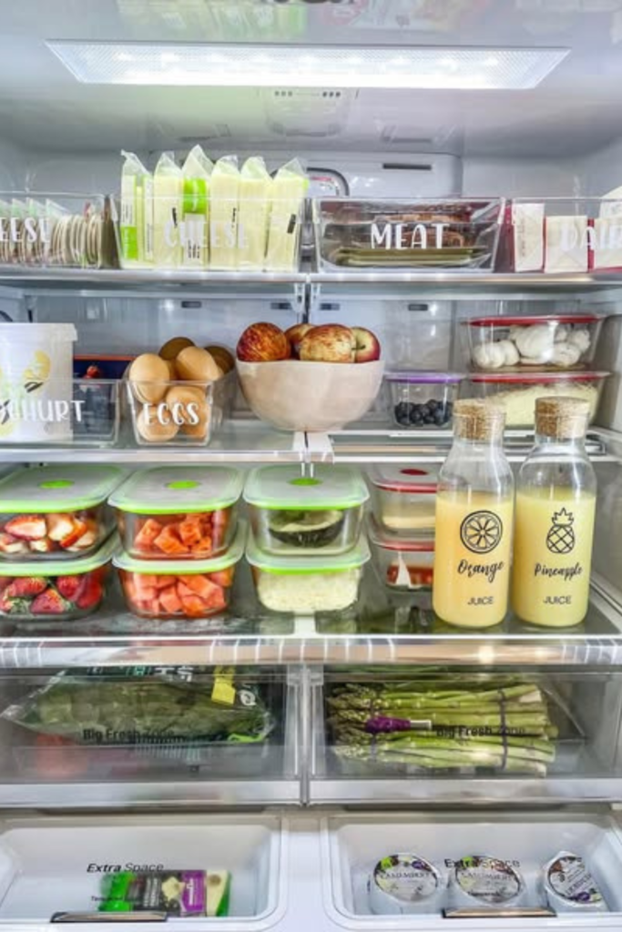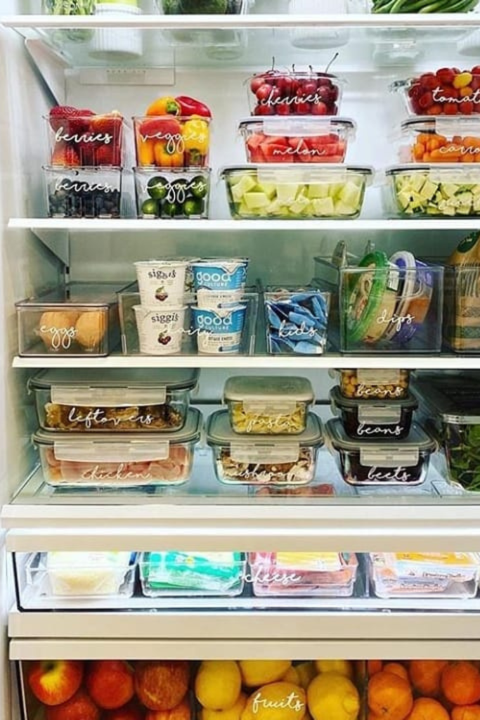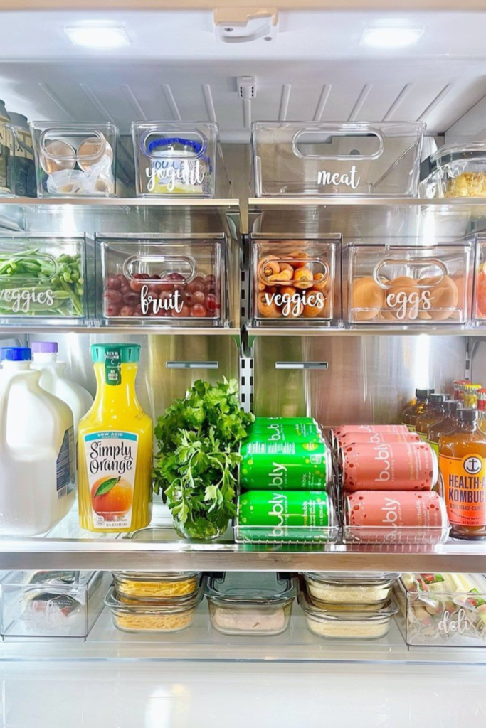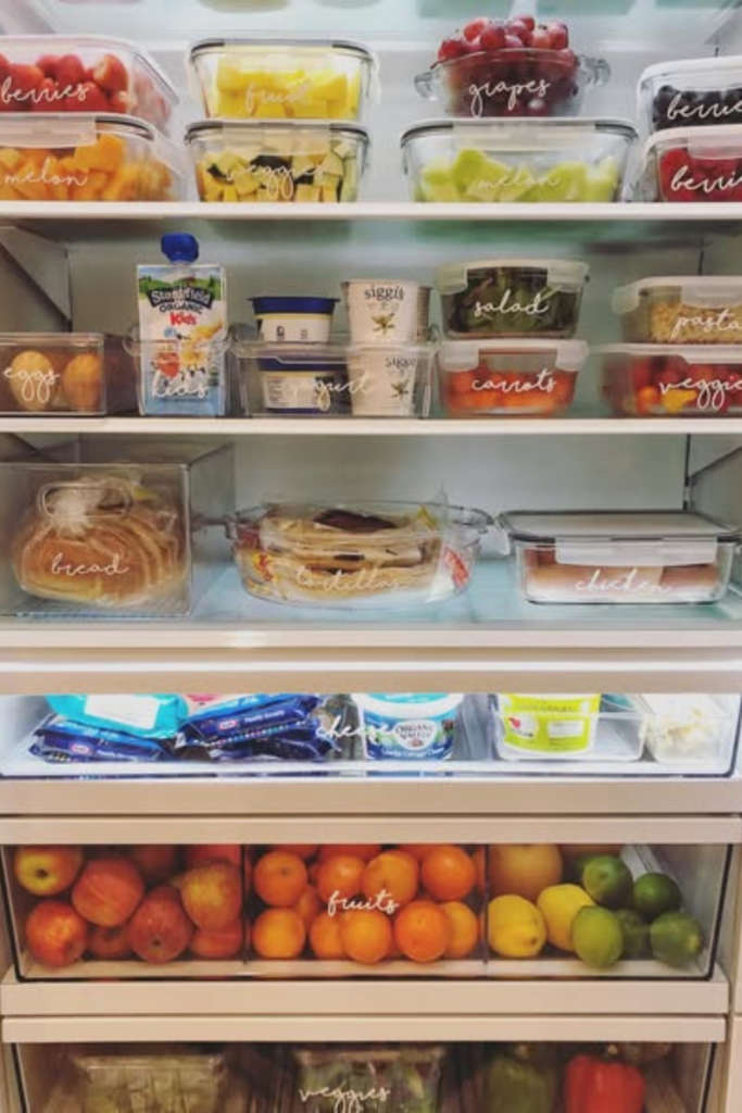 This fridge stays organized because every bin is labeled clearly, so food always goes back to the same spot.