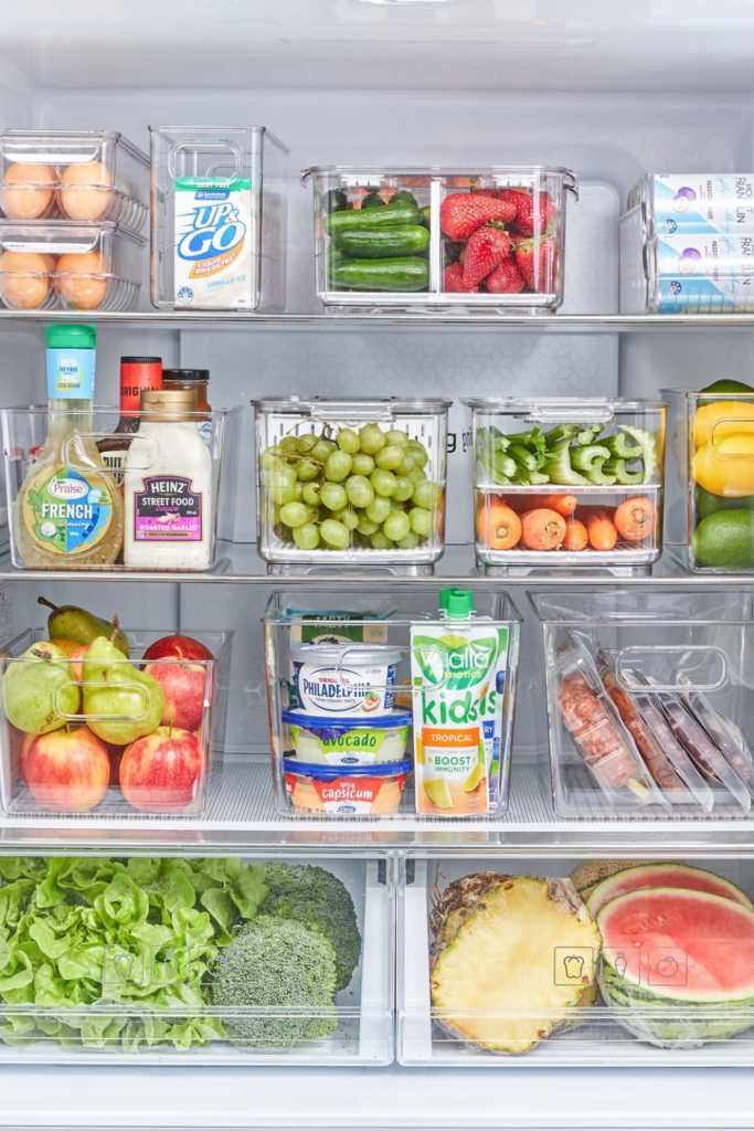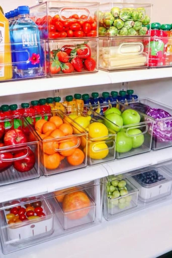 Recreate this by lining identical clear bins side by side and dedicating one item per bin apples, citrus, berries, greens.