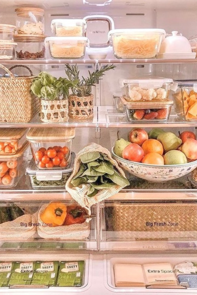 Hard plastic isn’t the only way to organize a fridge, this works best. Use woven baskets for produce, open bowls for fruit.