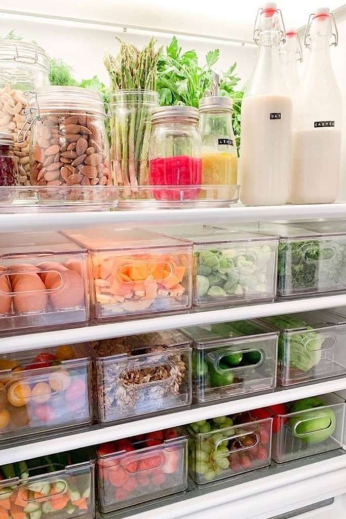Back-panel fridge lighting shines through clear plastic, keeping lower layers visible, taller bins work best on middle shelves.