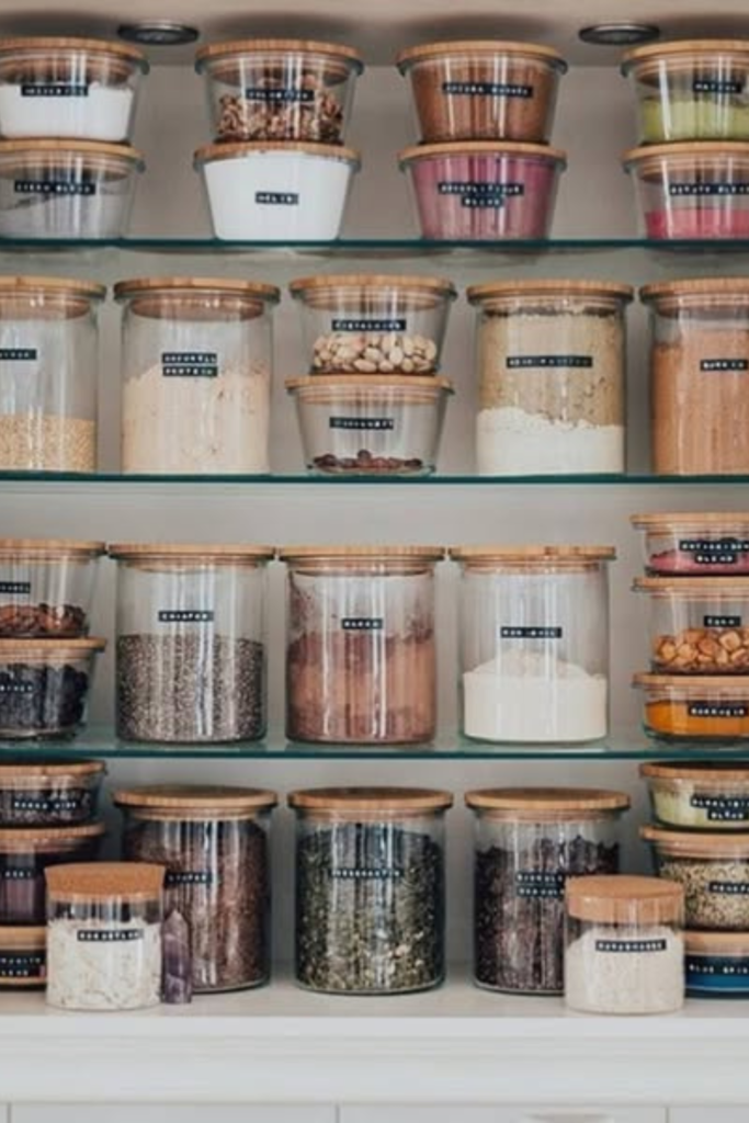 Too many half-open packages create visual noise and wasted food. Transferring grains, nuts, sauces into sealed glass jars.
