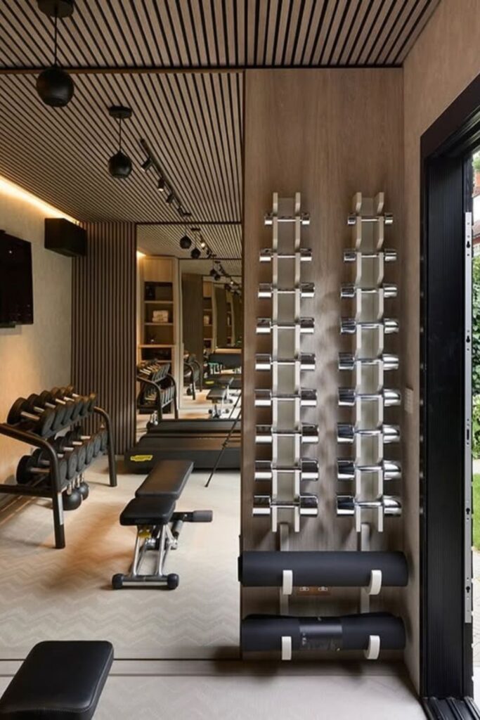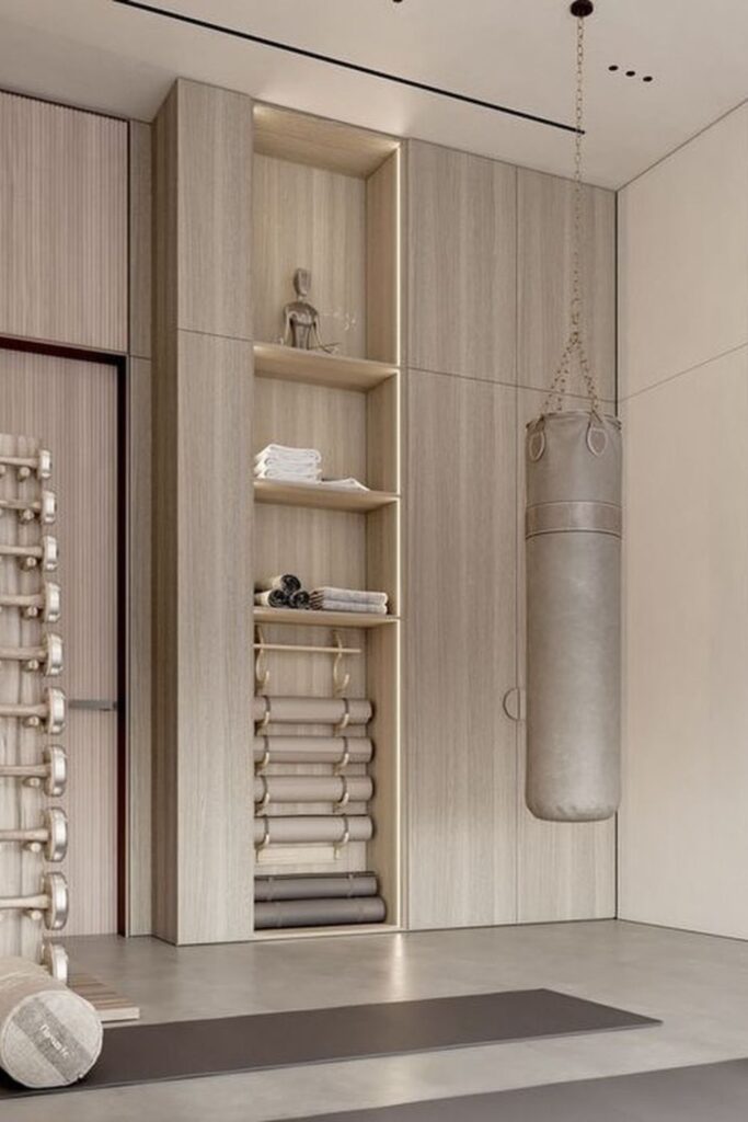 This kind of design works best in homes where the gym is in the same room as other rooms. The storage fits in with the building’s design instead of looking like a pile of training gear.