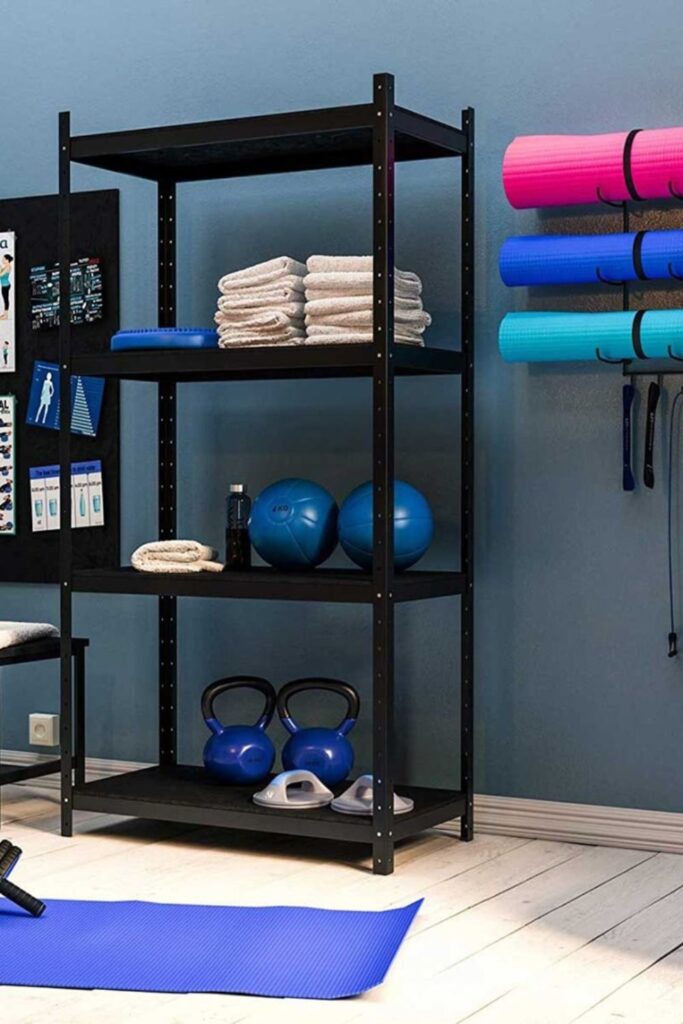 That can hold practically all of your workout stuff in one location. Metal shelves can easily hold lighter dumbbells, towels, and small boxes.