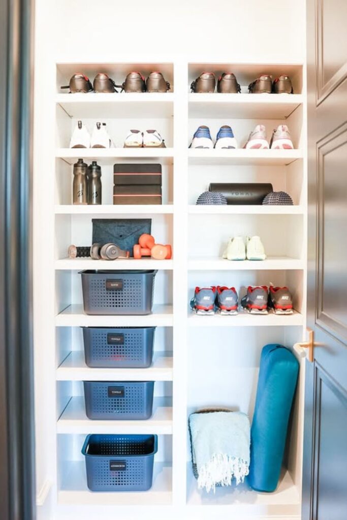 Workout gear multiplies quickly, and without a clear system it spreads across shelves, corners, and the floor.