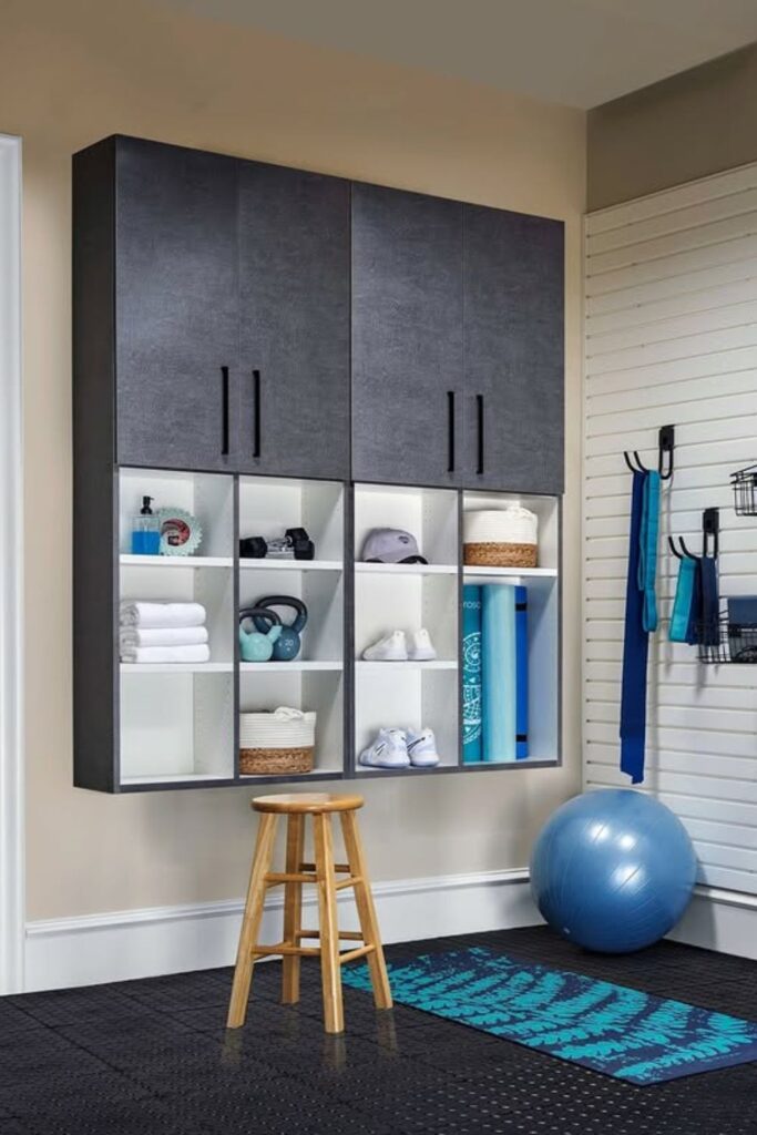 Open cubbies and wall-mounted cabinets work well together to keep workout gear organized and easy to get to.