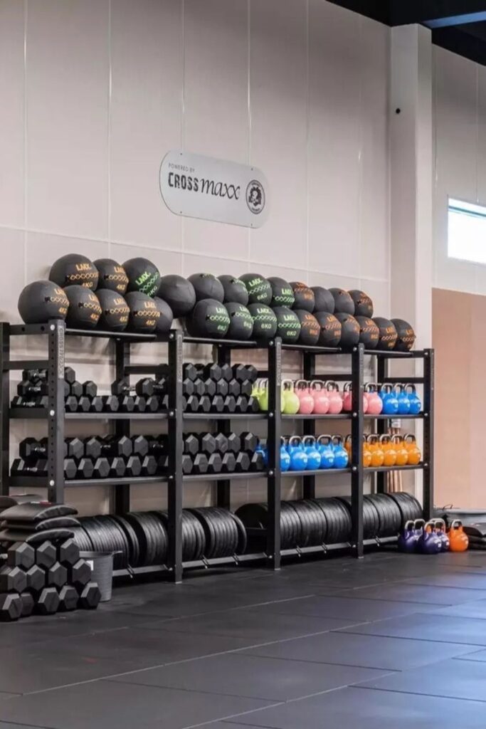 Underneath them, slimmer racks hold smaller medicine balls and dumbbells in tidy rows. This makes it easy to find the proper weight without having to look for it.