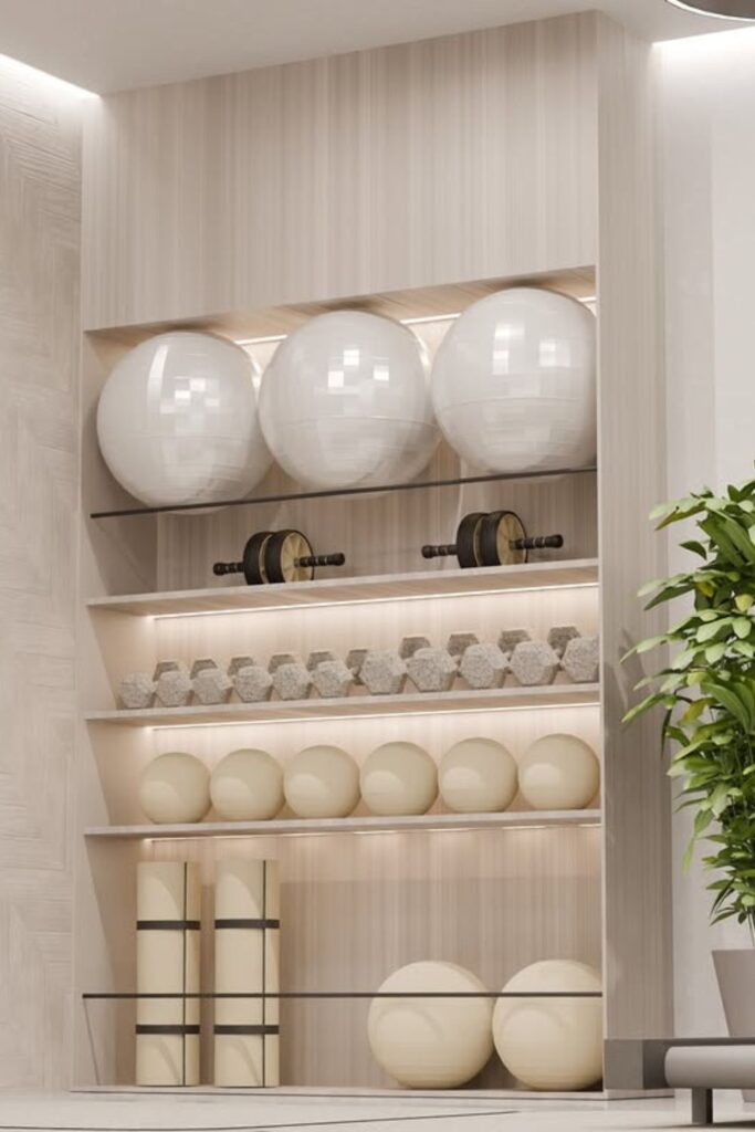 Nothing makes a gym feel organized faster than turning equipment into a clean visual display. A recessed storage wall like this creates a dedicated zone.