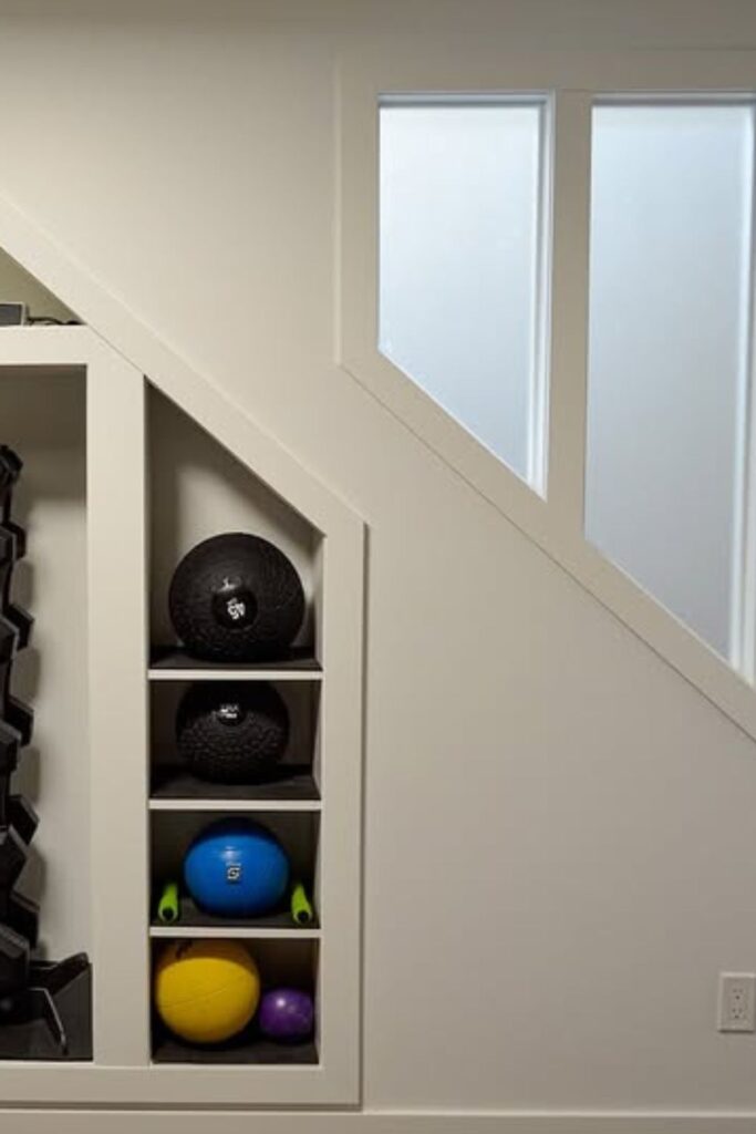 Unused corners under the stairs can quietly turn into one of the smartest storage spots in a home gym.