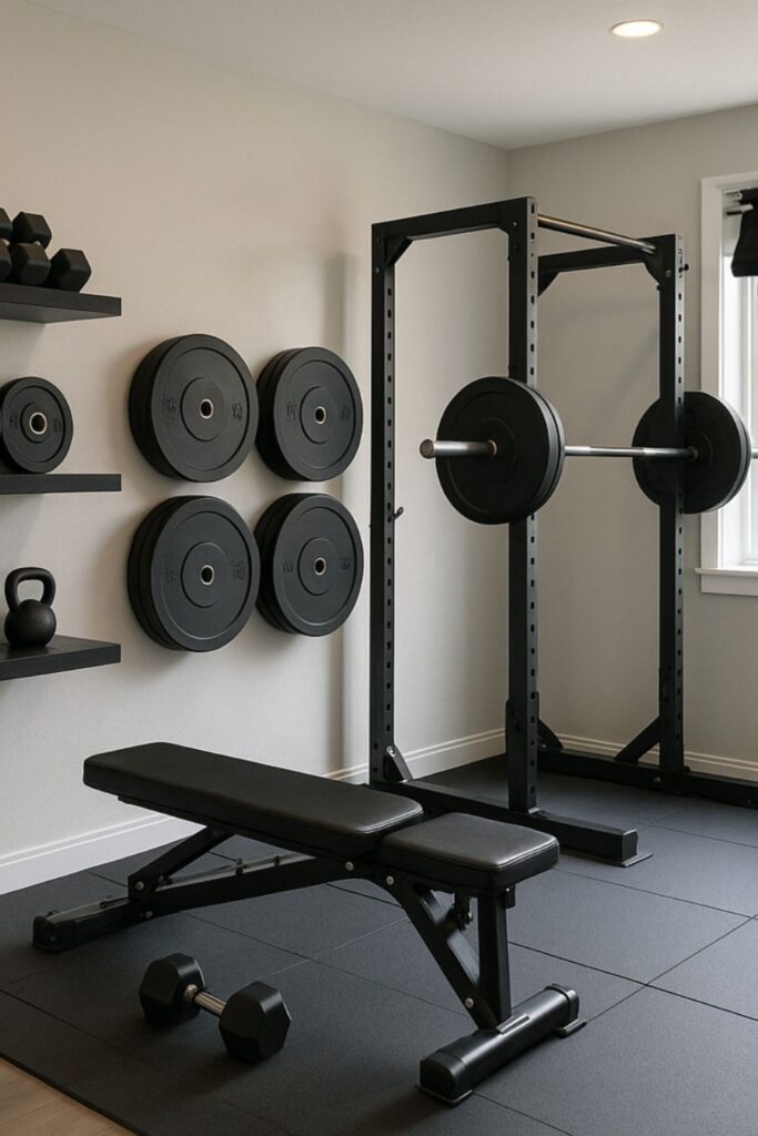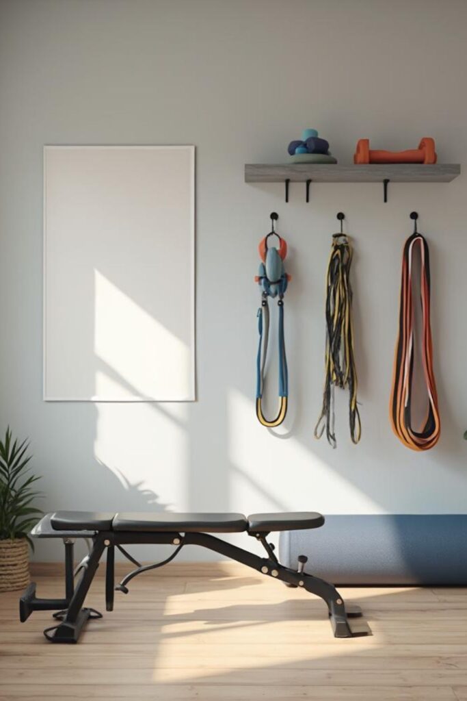 Vertical storage makes a tremendous impact in tiny gyms. Wall hooks, pegboards, and floating shelves keep things like exercise bands, mats, and dumbbells off the floor.