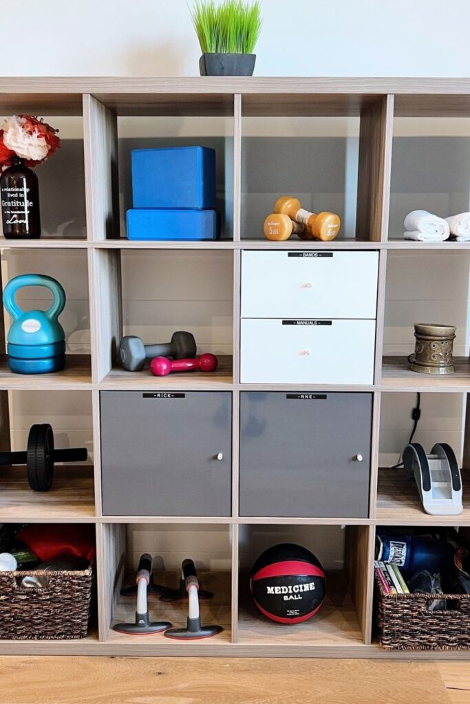 A simple cube shelf can quietly turn a messy workout corner into a system that actually works. Separate compartments stop everything from mixing together.