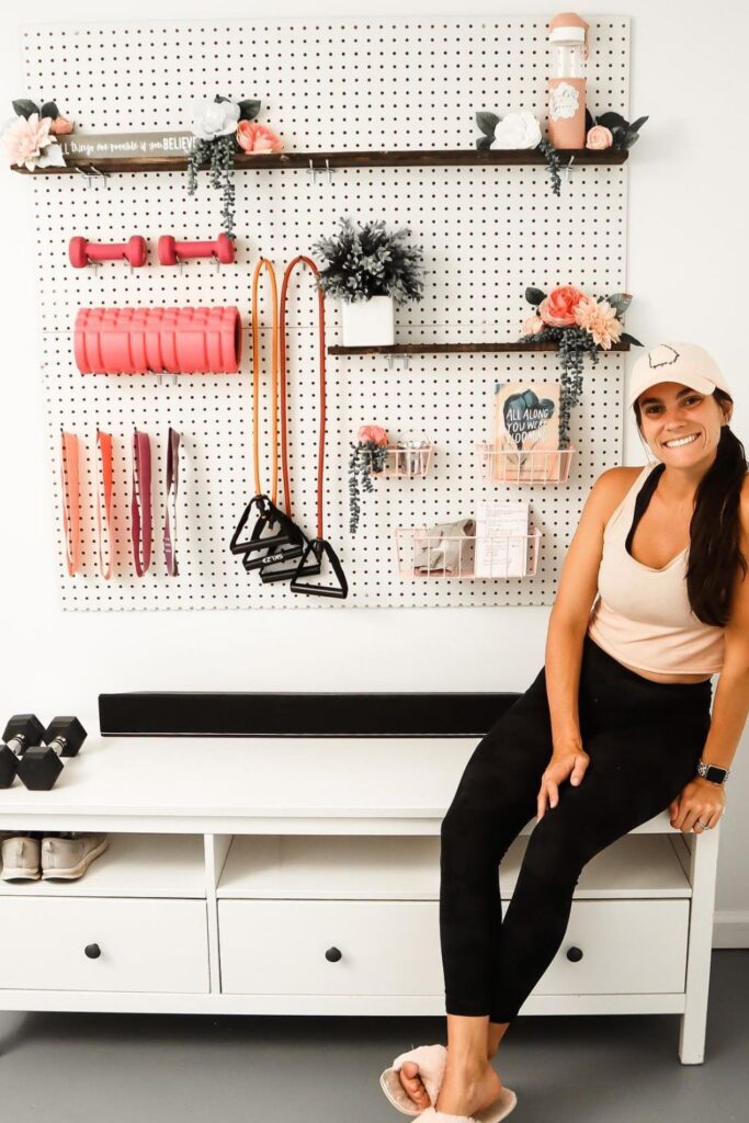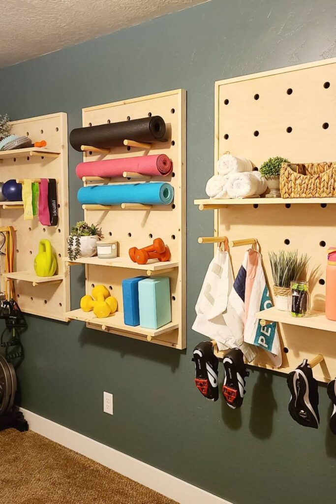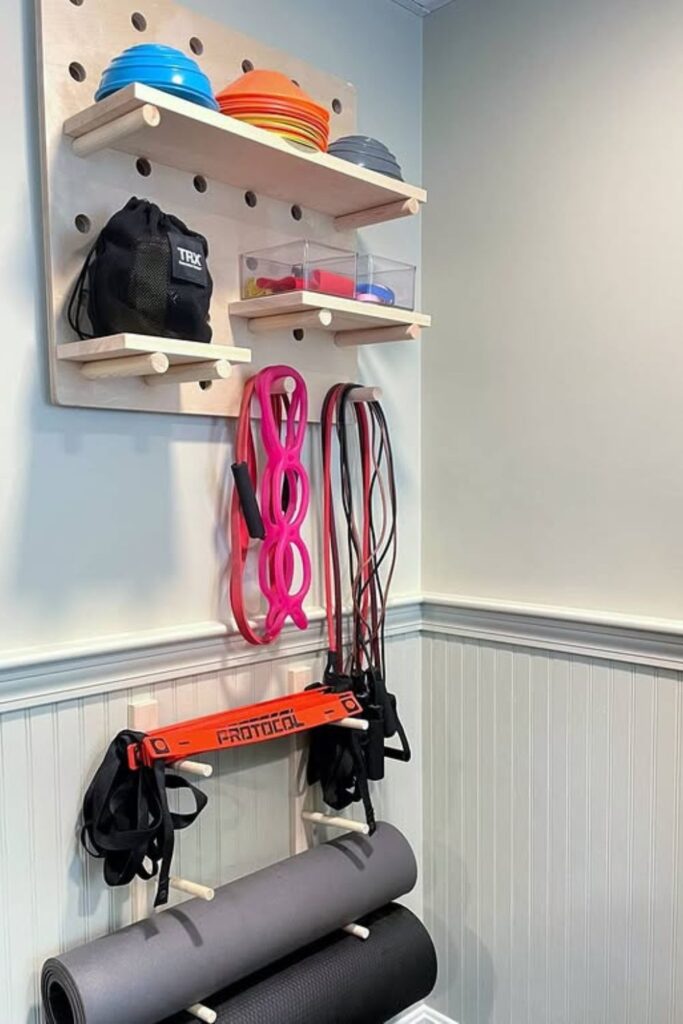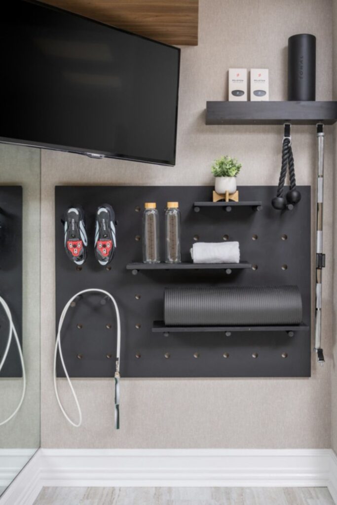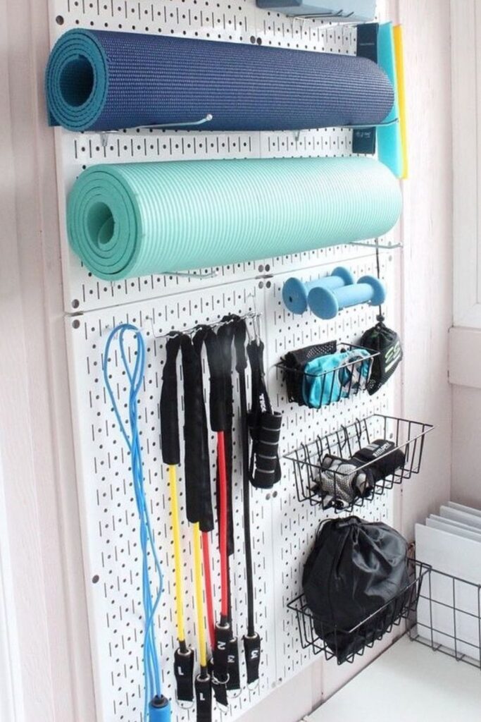 Workout spaces feel more inviting when storage blends function with a bit of personality. A large pegboard like this turns a blank wall into a neat display.