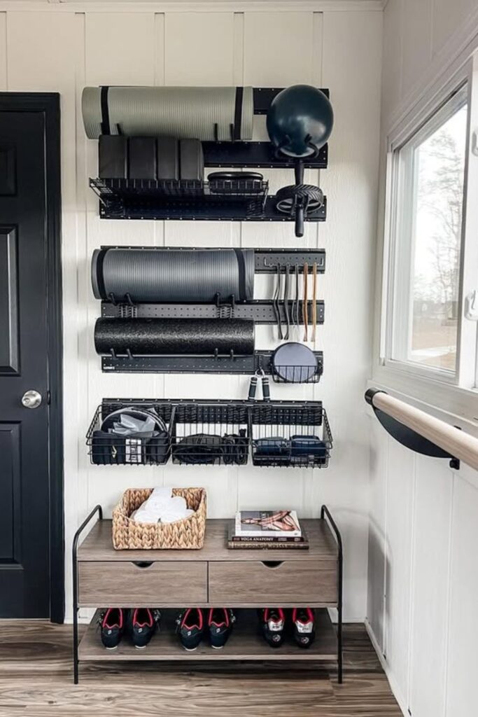 Small workout corners demand smart storage and a panel board like this turns a single wall into a compact command center for everyday gear.