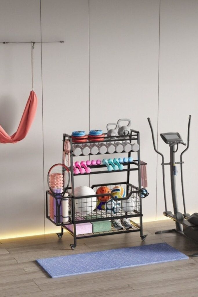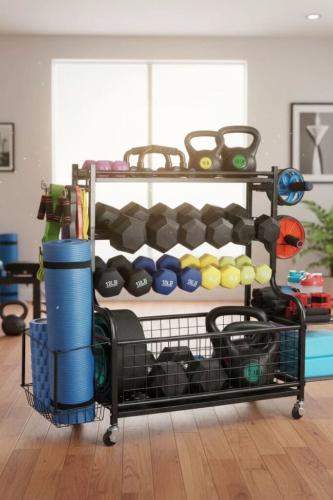 Gym gear often spreads across the room because every item lives in a different place. A mobile storage station fixes that by gathering everything into one organized hub.