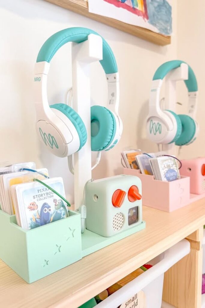 No bending, no cords getting tangled, and no looking around when it’s time to listen. This layout works best in youngsters’ study spaces, reading corners, or bedroom shelves.