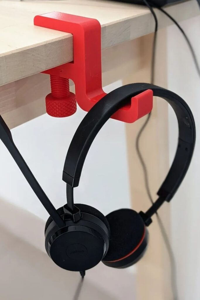 Without drilling or adhering anything to the desk, a clamp-style hook fixes that. Put the clamp on the edge of the desk and let the headphone band hang down from the hook below.