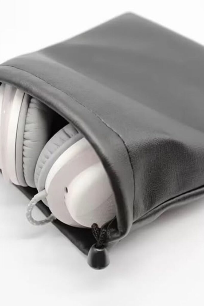 A silky drawstring pouch keeps them safe and makes it easy to put them away. Put the folded headphones inside, pull the cord tight, and they will stay safe.
