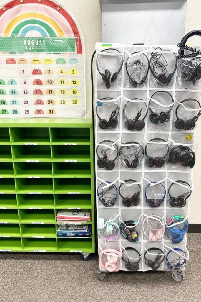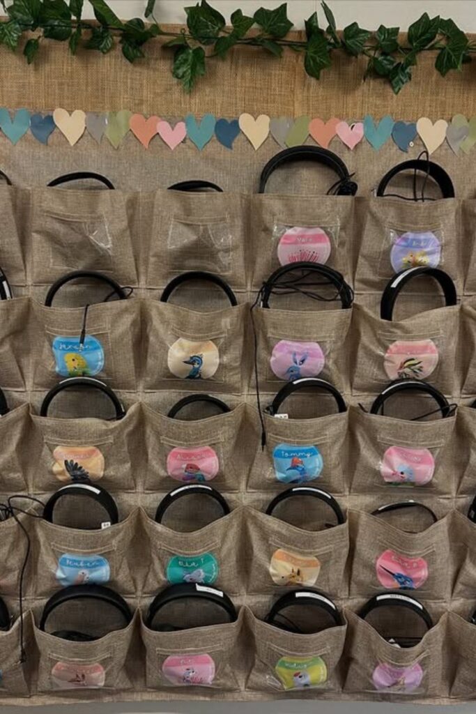 To keep everything in order, give each pocket a name or number. Put the organizer at eye level so that people can easily get and put back their headphones.