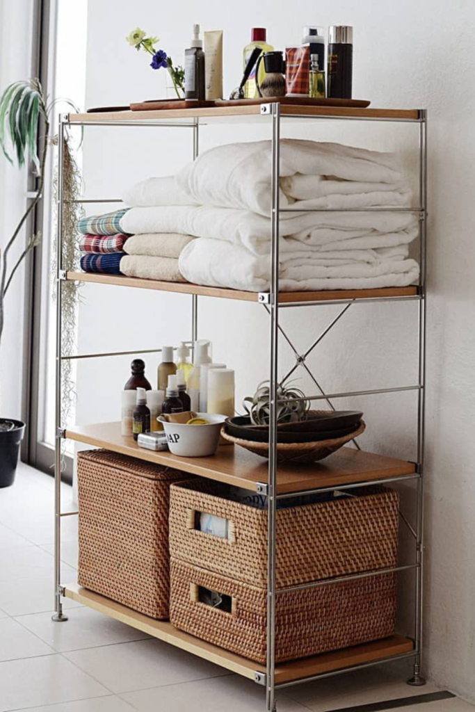 Recreate this by stacking towels by size, keeping daily products at eye level, and hiding backups in woven bins below.