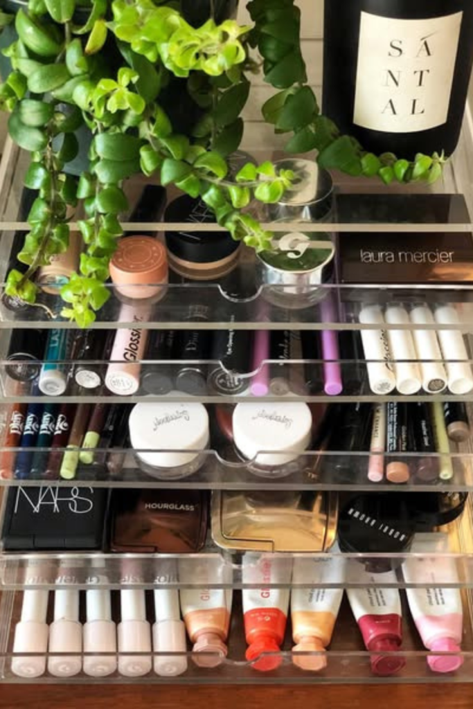 Assigning one layer to the face, one to the eyes, and one to the lips, keeping favorites on top, tiered acrylic drawers work best.