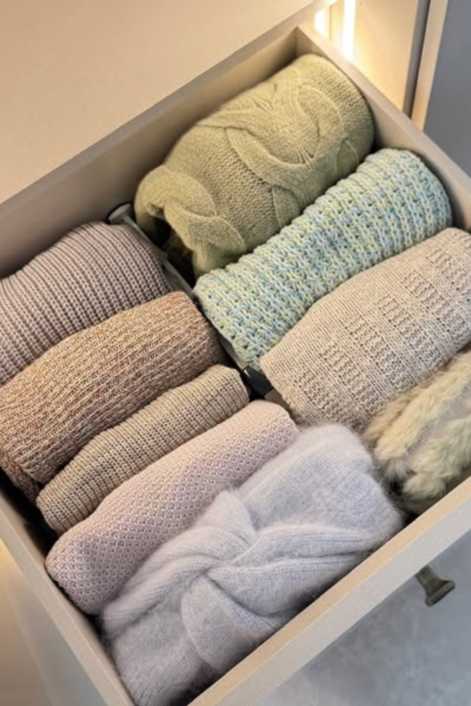 Seasonal knits stay usable once drawers stop turning into piles. Rolling or gentle folding works best for sweaters.