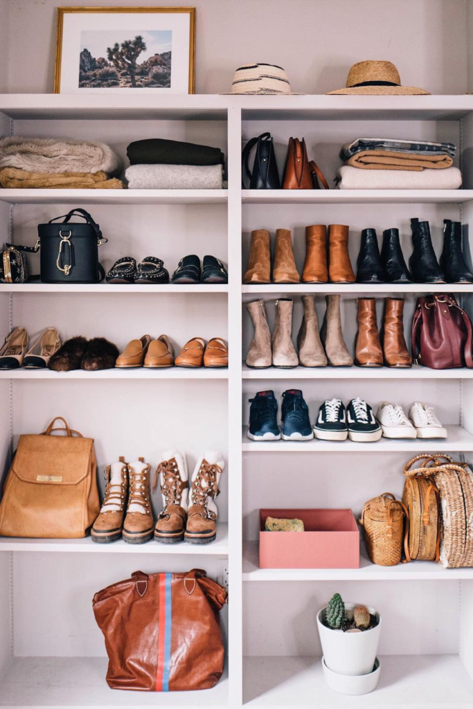 Closets stay calm once items live by type, not by outfit. Shoes, bags, and folded pieces grouped on open shelves.
