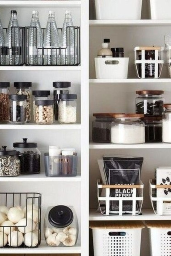 Food stays under control once shelves work by category. Clear jars and open baskets make pantry items easy to see.